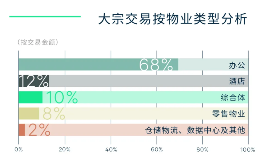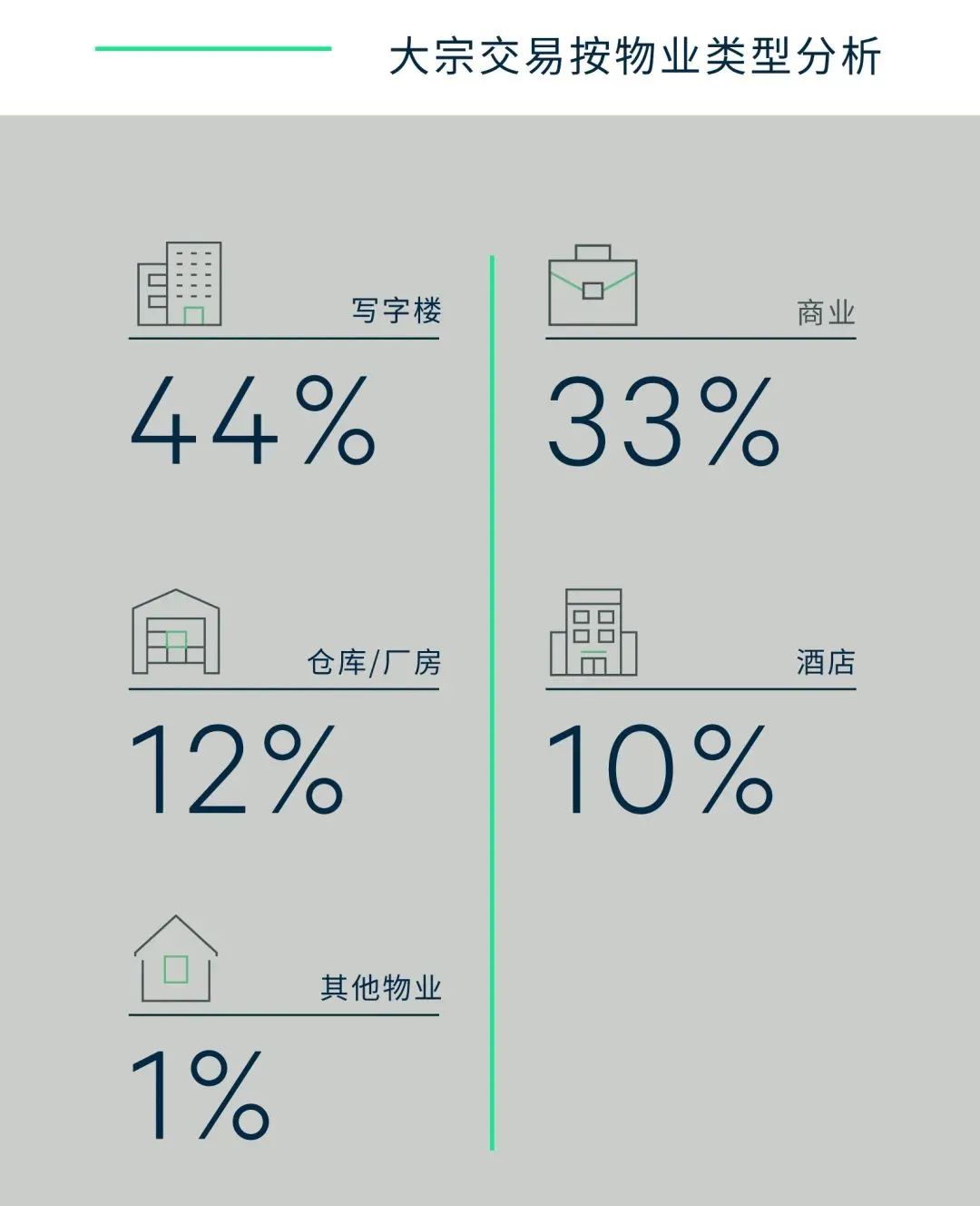 從成交業(yè)類型來看,寫字樓依舊是交易主體,占到總成交量的43%,零售物業(yè)交易上揚(yáng),而產(chǎn)業(yè)物流、數(shù)據(jù)中心的交易額在過去一年實現(xiàn)快速增長,成交量同比幾乎翻倍,占總成交額31%。