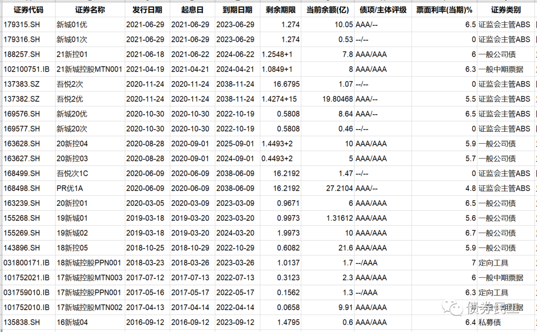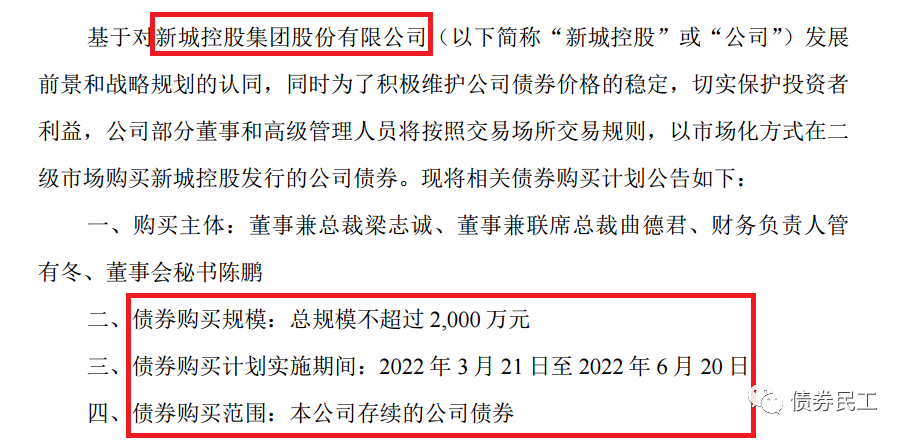 2、新城控股集團股份有限公司3月18日公告,公司部分高管以市場化方式在二級市場購買不超過2000萬元本公司發行的公司債券。目前新城控股存續債券21只,包括公司債券、資產證券產品、中期票據和定向工具。其中存續公司債券8只,存續公司債券金額為62.32億元。新城控股最近一次發行債券是在2021年6月29日發行了規模為2.548億元的“新城01優”、“新城01次”。