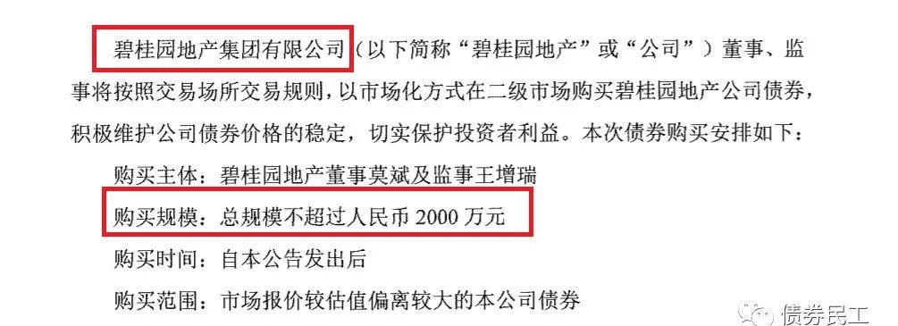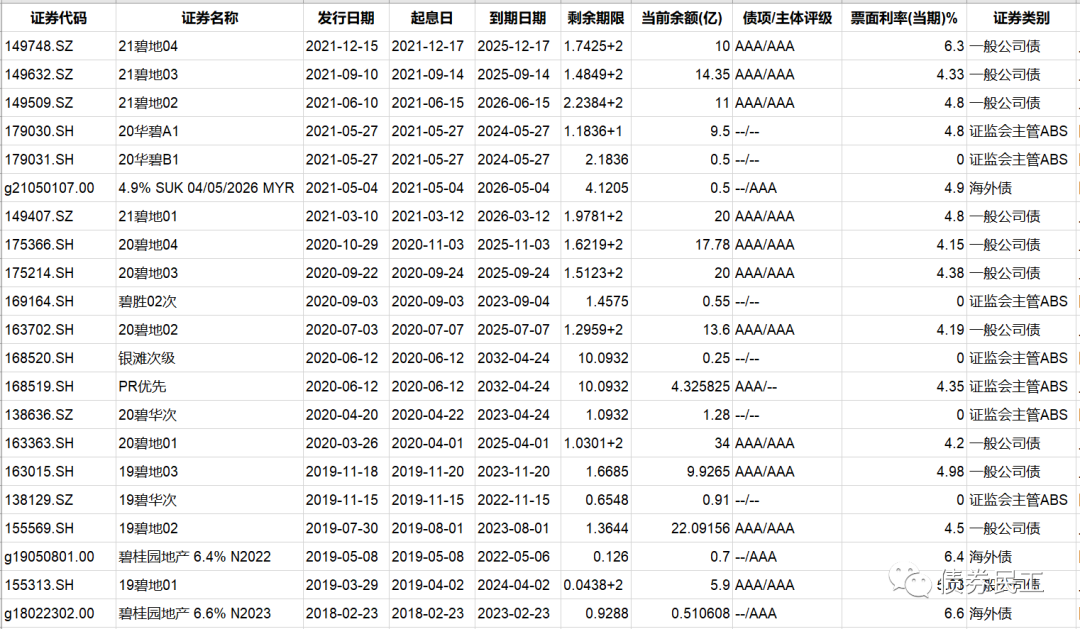 1、碧桂園地產集團有限公司于2022年3月17日公告,公司部分董事和監事以市場化方式在二級市場購買不超過2000萬元本公司發行的公司債券。目前碧桂園存續債券21只,包括公司債券、資產證券產品和美元債券。其中存續公司債券10只,存續公司債券金額為165.05億元。碧桂園最近一次發行債券是在2021年12月15日發行了規模為10億元的“21碧地04”,票面利率6.3%。