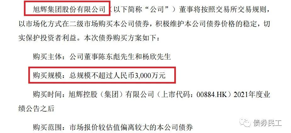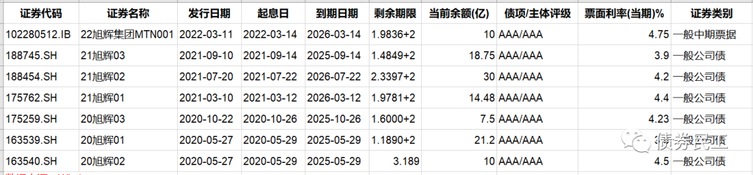 3、旭輝集團股份有限公司于2022年3月21日公告,公司部分董事以市場化方式在二級市場購買不超過3000萬元本公司發行的公司債券。目前旭輝集團存續債券7只,包括公司債券和中期票據。其中存續公司債券6只,存續公司債券金額為101.93億元。旭輝集團最近一次發行債券是在2022年3月14日發行了規模為10億元的“22旭輝集團MTN001”,票面利率4.75%。
