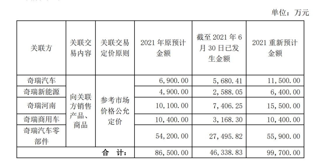 2021年9月末,伯特利曾披露《關(guān)于增加預(yù)計(jì)公司2021年度日常關(guān)聯(lián)交易的公告》。公司基于2021年上半年與奇瑞汽車及其關(guān)聯(lián)方業(yè)務(wù)開展情況以及發(fā)生的實(shí)際交易金額,預(yù)計(jì)公司2021年全年與奇瑞汽車及其關(guān)聯(lián)方將增加關(guān)聯(lián)交易1.32億元。