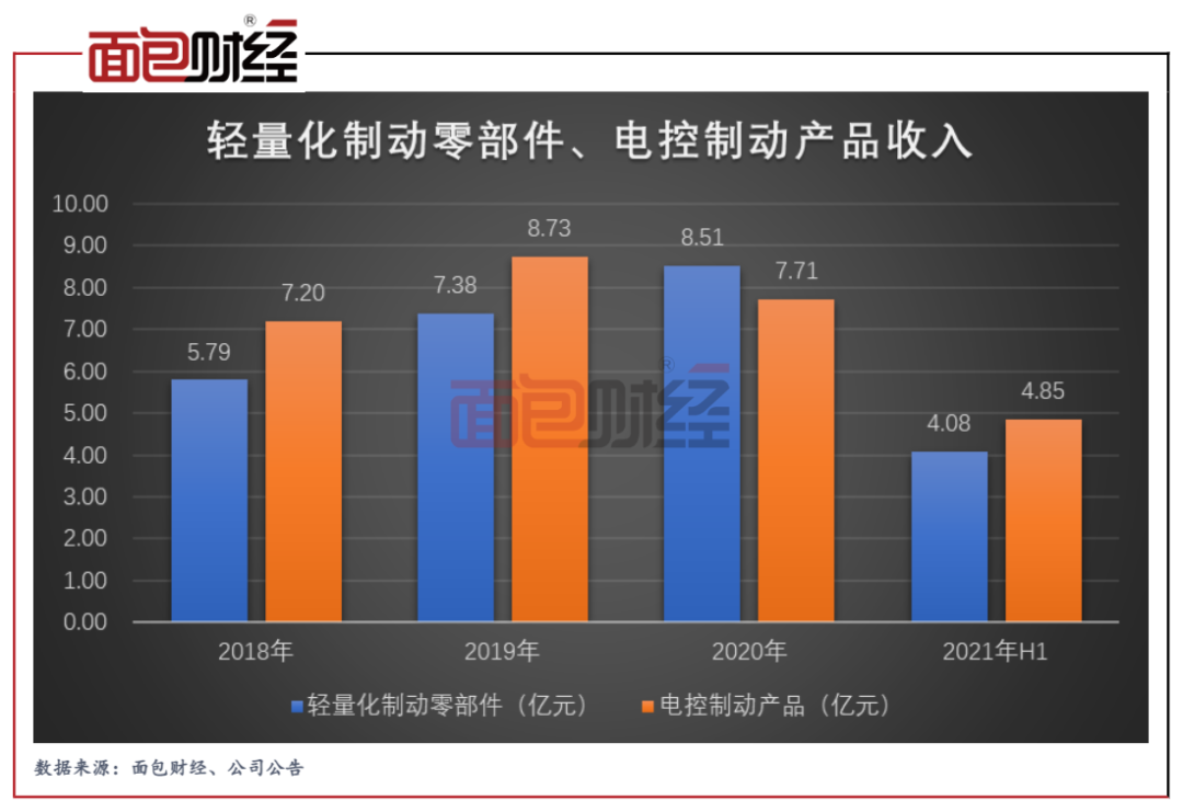 在市場(chǎng)寄予厚望的輕量化制動(dòng)零部件、電控制動(dòng)產(chǎn)品這兩大業(yè)務(wù)方面,伯特利2020年輕量化制動(dòng)零部件實(shí)現(xiàn)收入8.51億元,同比增長(zhǎng)約15%;電控制動(dòng)產(chǎn)品實(shí)現(xiàn)收入約7.71億元,相比上年的8.73億元甚至出現(xiàn)下降。