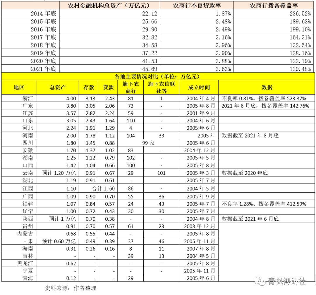 農(nóng)商行一定程度上能夠代表各地省聯(lián)社體系的質(zhì)量。截至2021年底,農(nóng)商行的不良貸款率和撥備覆蓋率分別為3.63%和129.48%,資產(chǎn)質(zhì)量整體比較堪憂。但是從公布資產(chǎn)質(zhì)量的部分地區(qū)來看,分化較為明顯。