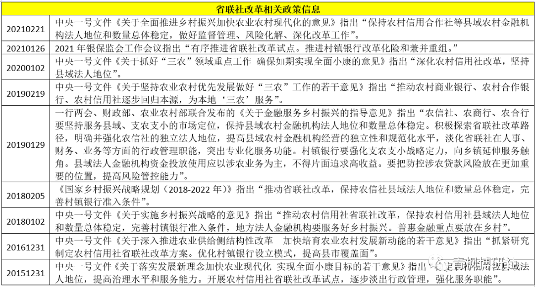 (1)2021年10月21日,銀保監(jiān)會首席檢查官、辦公廳主任王朝弟在國新辦發(fā)布會上表示“繼續(xù)深化農(nóng)信社改革已經(jīng)提上日程……把深化省聯(lián)社改革與提高農(nóng)信系統(tǒng)風(fēng)險防控能力作為重點,因地制宜,按照‘一省一策’的原則,支持各?。▍^(qū))從自身實際出發(fā),制定切實可行的農(nóng)信社改革方案……通過改革,能夠切實讓省聯(lián)社成為一個產(chǎn)權(quán)清晰、權(quán)責(zé)明確、政企分開、管理規(guī)范的現(xiàn)代化金融企業(yè)”,同時在該發(fā)布會上,王朝弟還透露絕大部分省份已經(jīng)上報了深化農(nóng)信社改革方案,且浙江省的農(nóng)信社改革方案即將落地。