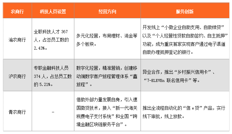 在經(jīng)營方向上,渝農(nóng)商行致力于多元化經(jīng)營,不僅獲批全國農(nóng)商行首家理財子公司,還參與設(shè)立了重慶小米消費金融有限公司,布局范圍較廣;滬農(nóng)商行強調(diào)以客戶為中心,高度重視數(shù)字化經(jīng)營和精準營銷,創(chuàng)建了“鑫旅程”移動端數(shù)字客戶旅程管理體系;青島農(nóng)商行則主動拓展合作平臺,借助外部力量發(fā)展自身,不僅引入了德國微貸技術(shù)解決農(nóng)戶和小微群體的融資難問題,還接入了“新一代海關(guān)稅費電子支付系統(tǒng)”和全國“跨境金融區(qū)塊鏈服務(wù)平臺”,支持積極支持中小企業(yè)參與國際競爭。