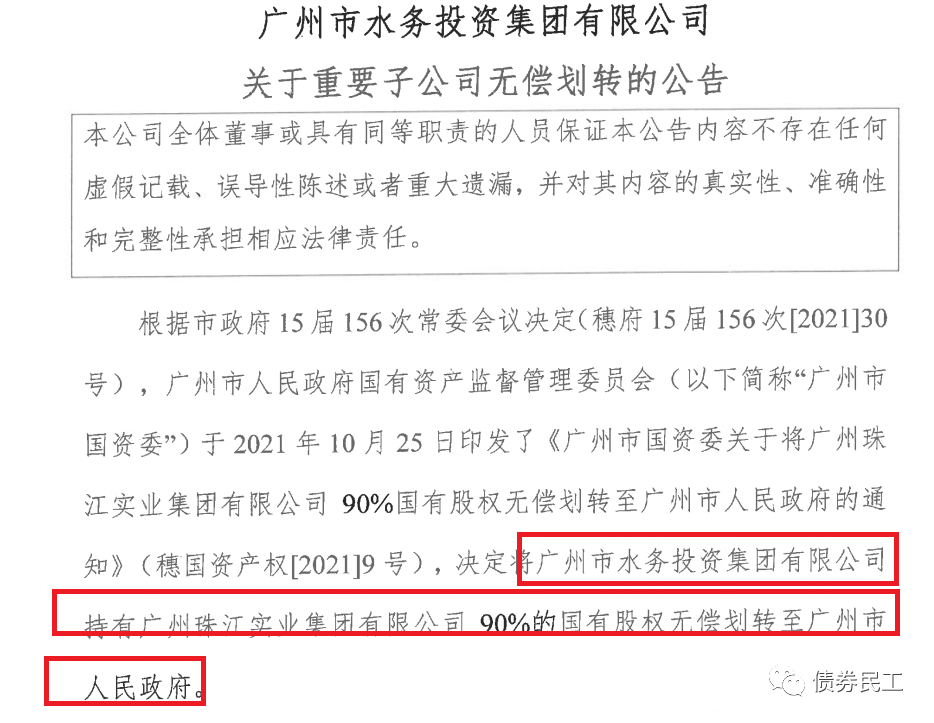 3、廣州市水務(wù)投資集團(tuán)有限公司(主體信用評級為AAA)公告,將公司持有的廣州珠江實(shí)業(yè)集團(tuán)有限公司90%的股權(quán)無償劃轉(zhuǎn)給廣州市人民政府。此次劃轉(zhuǎn)完成之后,公司不再持有廣州珠江實(shí)業(yè)集團(tuán)有限公司的股權(quán)。
