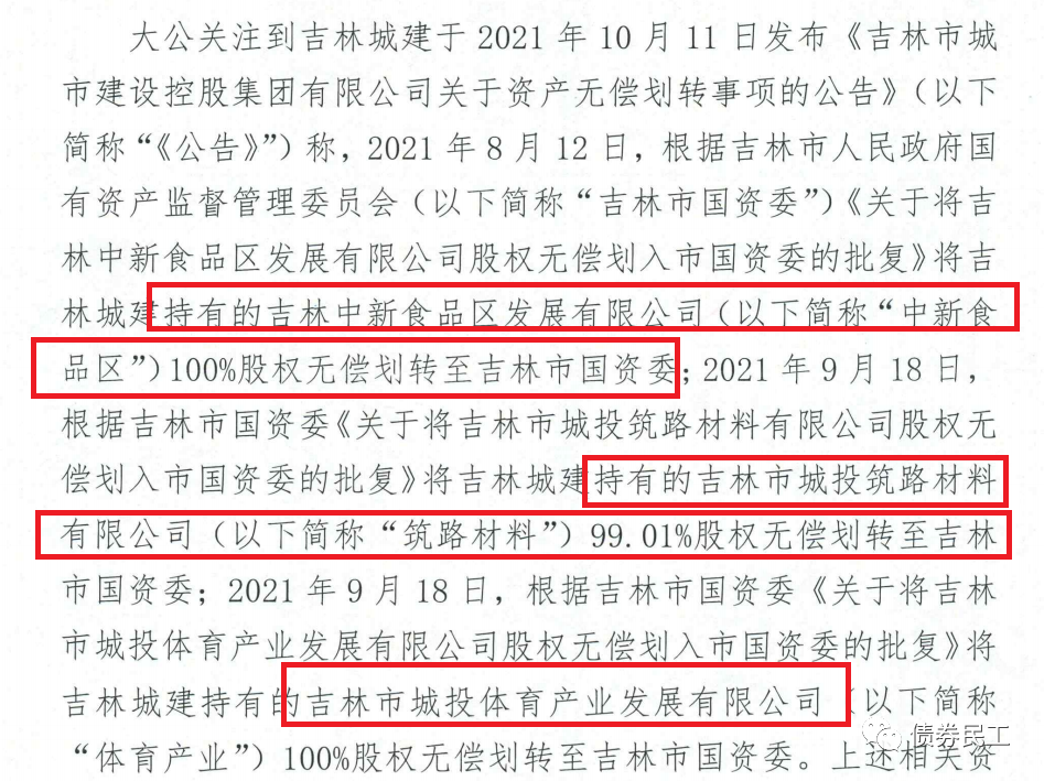 7、吉林市城市建設(shè)控股集團(tuán)有限公司(主體信用評級為AA+)公告,將吉林中新食品區(qū)發(fā)展有限公司100%股權(quán)、吉林市城投筑路材料有限公司99.01%股權(quán)和吉林市城嘔吐體育產(chǎn)業(yè)發(fā)展有限公司100%股權(quán),劃轉(zhuǎn)至吉林市國資委。