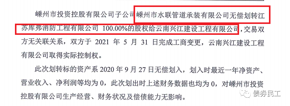 6、嵊州市投資控股有限公司(主體信用評級為AA+)公告,將子公司持有的江蘇庫弗消防工程有限公司100%的股權(quán)無償劃轉(zhuǎn)給云南興江建設(shè)工程有限公司(實(shí)際控制人為自然人)。不過該劃出的子公司凈資產(chǎn)、營業(yè)收入和凈利潤均為0。