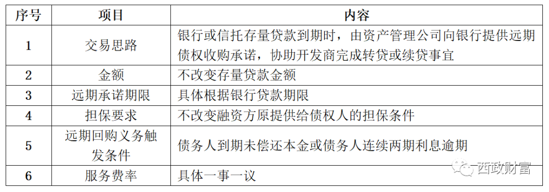 在具體操作方面,對于融資方(債務人)即將到期的債權,債務人與債權人(銀行)、資產管理機構簽署《資產管理服務合同》,約定融資方在歸還銀行到期債務后,由銀行繼續給予授信和放款,并由資產管理機構與銀行簽署《遠期債權轉讓協議》,協助開發商完成轉貸或續貸事宜,在債務人到期未還本或連續兩期利息逾期時,由資產管理機構收購該債權。具體融資要素如下所示: