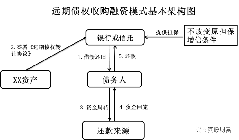 對于開發商或其關聯的非房主體存量經營性物業貸款、流貸等即將到期的,因銀行的額度收縮、準入條件趨嚴等原因,目前很多開發商的轉貸或續貸都面臨很多的阻力。為順利解決該問題,目前市面上涌現出大量的資產管理公司通過與銀行或信托機構簽訂《遠期債權轉讓協議》以協助開發商的轉貸或續貸的案例。比如銀行在開發商歸還到期的貸款后繼續給予授信和放款,資產管理公司向銀行承諾遠期回購銀行對開發商的債權,由此間接起到擔保、增信等作用,同時資產管理公司在上述開發商的轉貸或續貸過程中收取相應的服務費用。其基本操作模式如下: