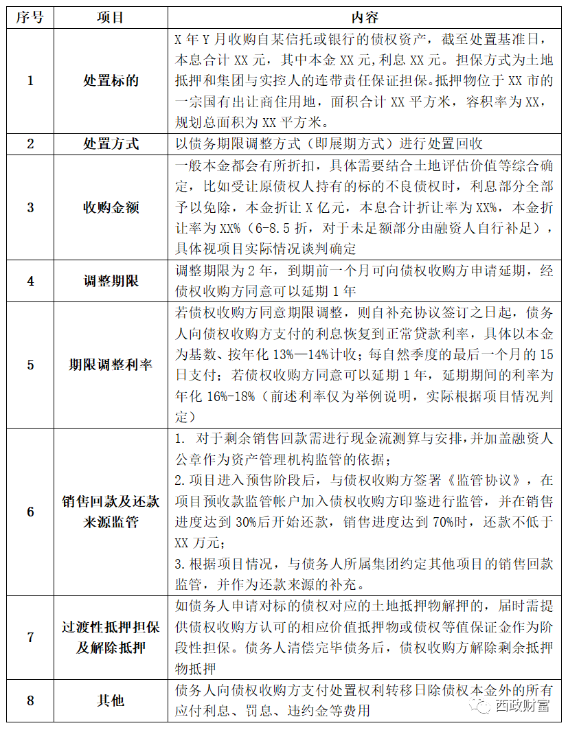 資產管理公司打折收購銀行、信托等機構對開發商的到期債權是不良處置業務的常見模式,資產管理公司收購債權后的處置方案中,債務期限調整、訴訟清收以及公開轉讓是最常見的三種方式。其中,資產管理公司收購到期債權后給予債務人展期是最常規的債務處置思路,在該操作過程中,由資產管理機構打折(6折-8.5折,具體一事一議)收購銀行或信托等金融機構對開發商的到期債權,對于債務人有強烈的期限調整意向,并愿意按照一定年利率向債權收購方支付利息的,資產管理公司一般都會準予債務人在兩年內或約定時間內清償全部債務。此外,考慮到抵押物的位置較為優越以及抵押率較為理想的情況下,在資產管理機構(債權收購方)認為抵押物具備變現能力的情況下,一般都可給予該債務一定的寬限期。具體融資要素示例如下: