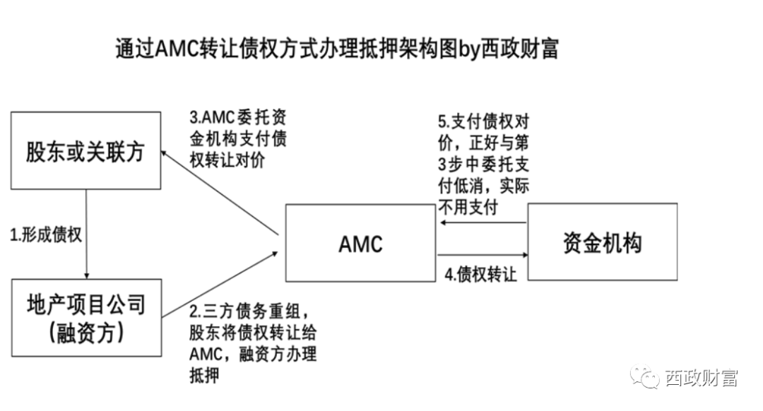 1. 通過AMC放款實質為資金方不直接放貸給融資方,而是通過AMC購買融資方作為債務人的債權,債權中附帶抵押權,即可以將AMC理解為類似銀行委貸角色;