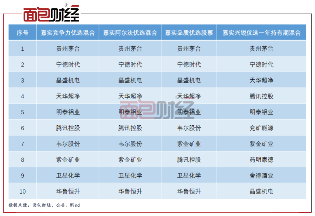 查閱這4只產品2022年一季報的前十大持倉發現,這些基金的持倉高度重合。部分產品如嘉實競爭力優選混合、嘉實阿爾法優選混合連持倉順序、投資策略也高度雷同。