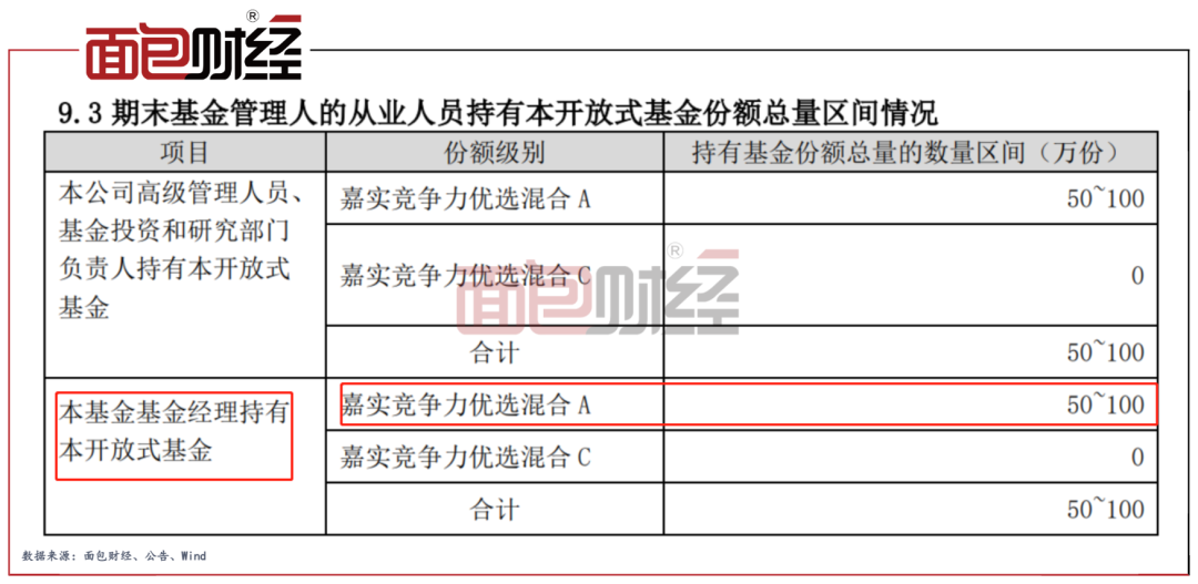 上述4只產品中,嘉實基金的從業人員認購的基金份額占比較低,其與基金份額持有人利益之間的綁定可能并不十分緊密。以嘉實競爭力優選混合為例,2021年末嘉實基金從業人員合計持有基金份額約137.55萬份,僅占基金總份額的0.02%。其中,基金經理持有的份額在50萬份至100萬份之間。