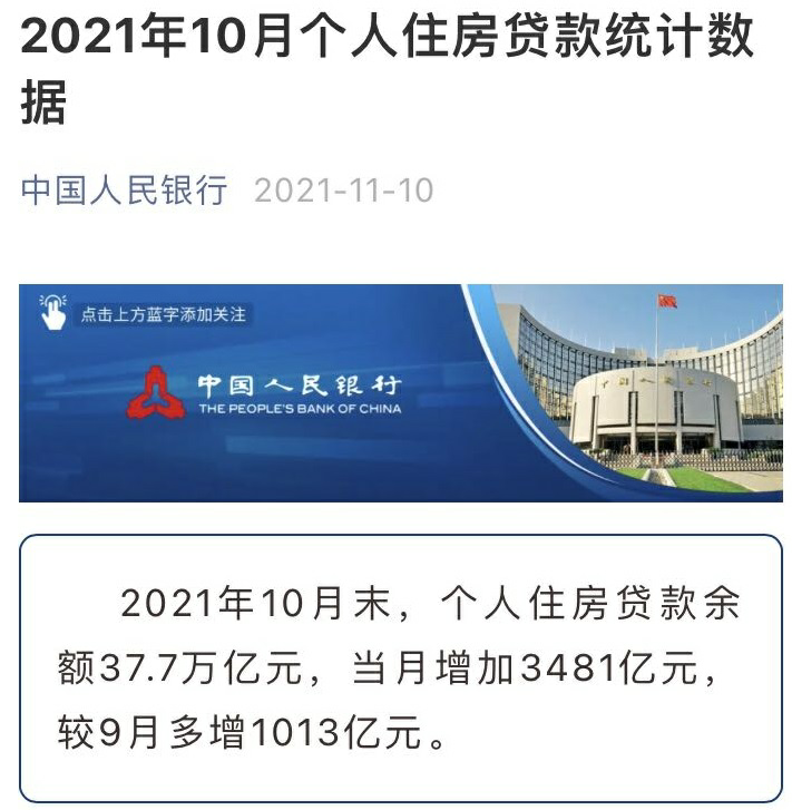 11月10日晚,央行官方微信號在發(fā)布了10月金融數(shù)據(jù)之后,單獨發(fā)文說10月個人住房貸款環(huán)比增加了1013億元。