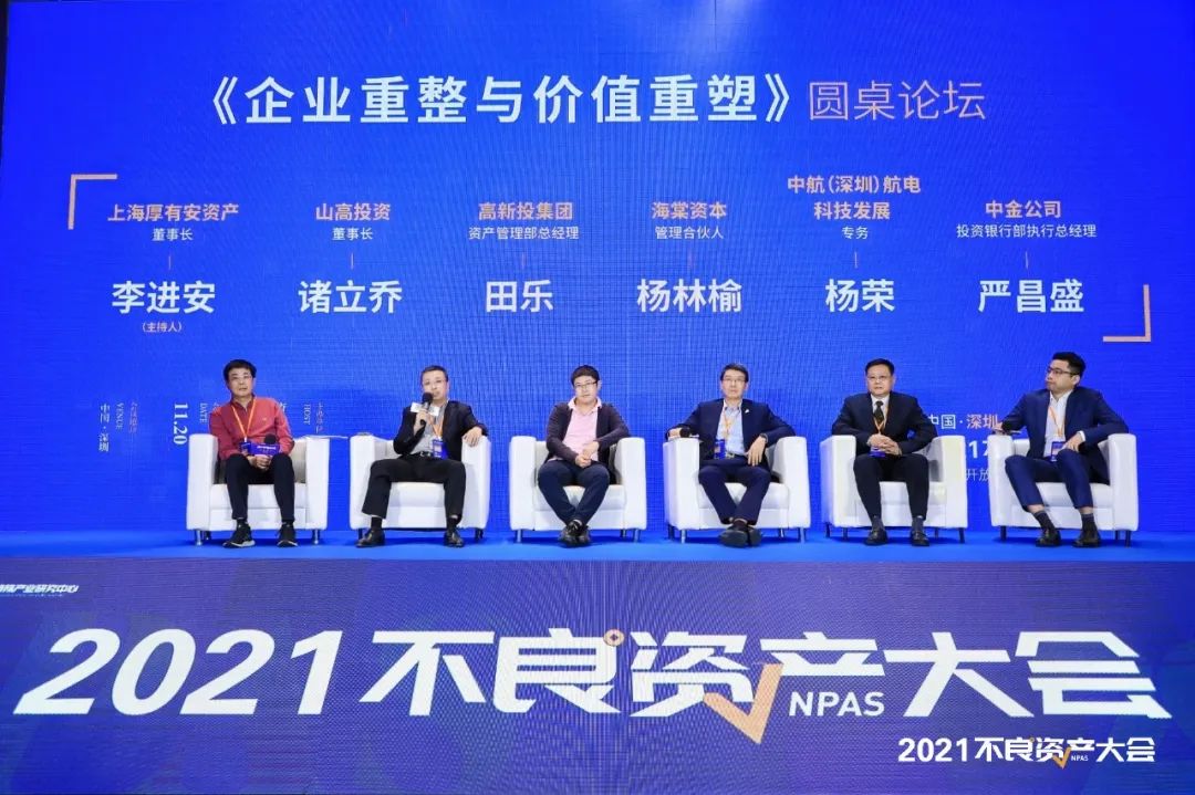 大會第一場圓桌:《企業(yè)重整與價值重塑》由上海厚有安資產(chǎn)董事長李進(jìn)安主持,與山高投資董事長諸立喬 、高新投集團資產(chǎn)管理部總經(jīng)理田樂、海棠資本管理合伙人楊林榆、深航電專務(wù)楊榮、中金公司投資銀行部執(zhí)行總經(jīng)理嚴(yán)昌盛一起對話。