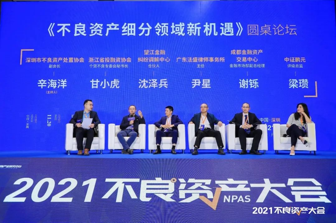 大會最后一場圓桌《不良資產(chǎn)細(xì)分領(lǐng)域新機遇》,由深圳不良資產(chǎn)處置協(xié)會副會長辛海洋主持,與浙江省投融資協(xié)會個貸不良專委會秘書長甘小虎、望江金融糾紛調(diào)解中心合伙人沈澤兵、廣東法盛律師事務(wù)所主任尹星、成都金融資產(chǎn)交易中心金融市場部副總經(jīng)理謝鑠、中證鵬元評級總監(jiān)梁瓚一起對話。