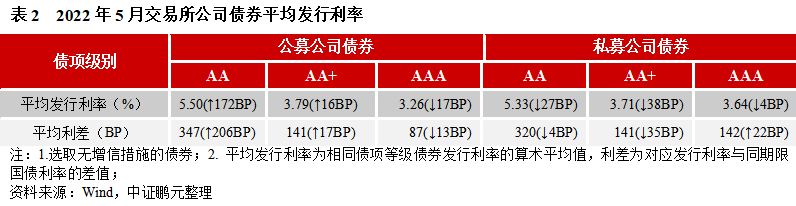 就發(fā)行利率而言,2022年5月份交易所公司債券的最高利率為7.80%,較上月最高利率下降10BP;最低發(fā)行利率為2.10%,較上月最低利率下降45BP。與4月份相比,公募公司債券方面,AAA級(jí)平均發(fā)行利率下行17BP、利差收窄13BP,AA+級(jí)平均發(fā)行利率上行16BP,利差擴(kuò)大17BP,AA級(jí)平均發(fā)行利率上行172BP、利差擴(kuò)大206BP;私募公司債券方面,AAA級(jí)平均發(fā)行利率下行4BP、利差擴(kuò)大22BP,AA+級(jí)平均發(fā)行利率下行38BP,利差收窄35BP,AA級(jí)發(fā)行利率下行27BP、利差收窄4BP。