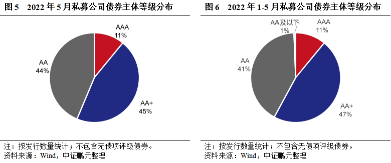 綜合2022年1-5月份的情況來(lái)看,主體級(jí)別仍以中高等級(jí)為主,AAA級(jí)、AA+級(jí)、AA級(jí)主體評(píng)級(jí)占比分別為39%、35%、26%。其中,公募公司債AAA級(jí)、AA+級(jí)、AA級(jí)主體評(píng)級(jí)占比分別為77%、19%、4%;私募公司債AAA級(jí)、AA+級(jí)、AA級(jí)及AA-及以下主體評(píng)級(jí)占比分別為11%、47%、41%、1%。