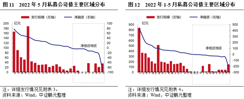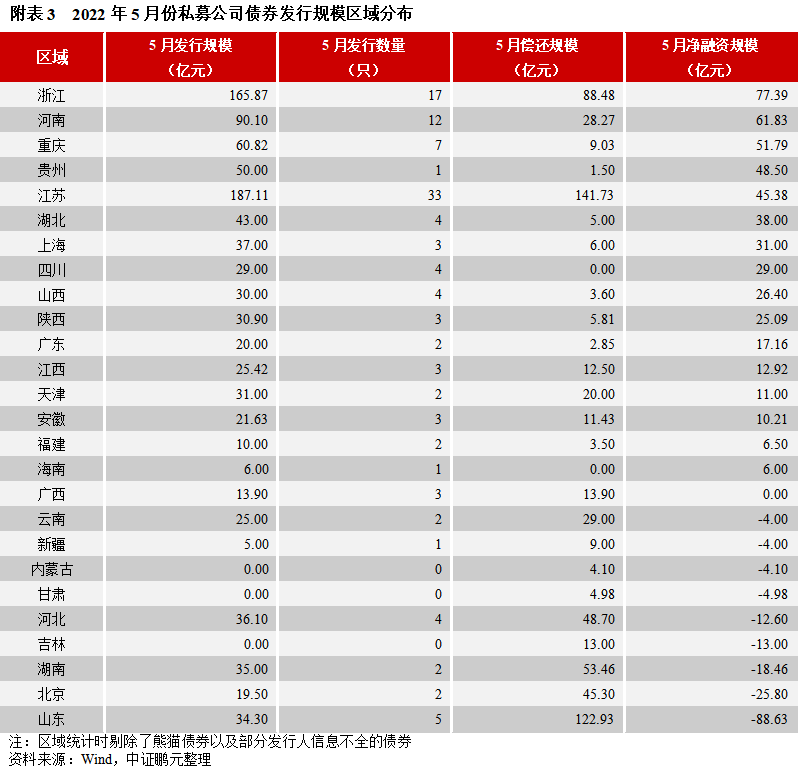 私募公司債券方面,2022年5月份,公募公司債券的發(fā)行人分布于23個(gè)地區(qū),以江蘇、浙江、河南等地為主。從發(fā)行規(guī)模來(lái)看,江蘇發(fā)行187.11億元位居榜首,浙江發(fā)行165.87億元位居第二,河南發(fā)行90.10億元位居第三位,發(fā)行數(shù)量分別為33只、17只、12只。浙江、河南、重慶分別以?xún)羧谫Y77.39億元、61.83億元、51.79億元位于前三位,山東、北京、湖南分別凈償還88.63億元、25.80億元、18.46億元。綜合1-5月,江蘇以發(fā)行209只、累計(jì)發(fā)行規(guī)模828.02億元位居首位,遠(yuǎn)高于其地區(qū);浙江以發(fā)行104只、累計(jì)發(fā)行規(guī)模510.18億元位居第二;山東以發(fā)行68只、累計(jì)發(fā)行規(guī)模364.09億元位居第三;浙江、安徽、江蘇分別以累計(jì)凈融資449.80億元、315.27億元、211.15億元位于前三位,北京、云南、新疆分別凈償還199.30億元、43.61億元、42.80億元。