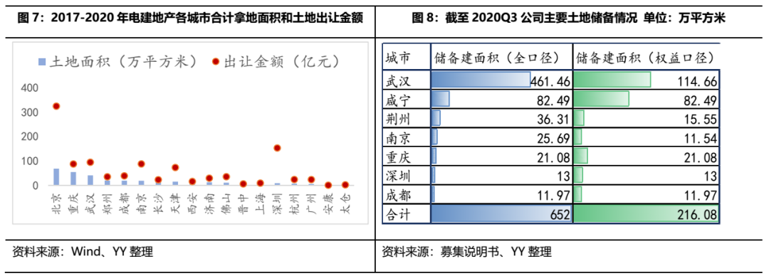 銷售方面,與行業水平相比,電建地產2017-2019年全口徑和權益口徑銷售金額排名均有所滑坡,銷售增速也低于TOP100房企的行業平均水平,但隨著公司2020年下半年開始發力,各項銷售指標有所提升,公司2020年權益口徑銷售金額增長217億元。