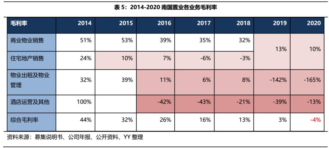 分別考察各業務板塊毛利率,發現公司的商業物業銷售業務運作整體比較健康,但營收占比較大的住宅地產銷售連年保持低毛利,物業出租和酒店運營雖然收入貢獻有限,但虧損更為嚴重。