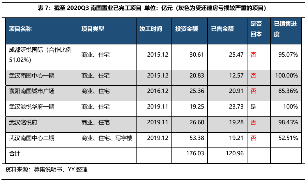 截至2020年9月底,南國置業公布的6個已完工項目,4個項目在武漢,其中5個項目均未收回投資成本,以當前的銷售金額和進度來看,即使未售罄項目售完也很難覆蓋投資金額,六個項目已投資累計176.03億元,已售金額僅累計120.96億元。