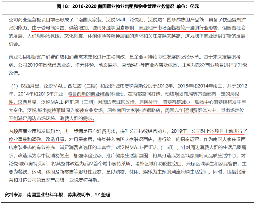 物業出售業務方面,2016-2019年公司對旗下商業產品線進行了大規模的改造,期間內物業出售及物業管理板塊的毛利率一直很低。2019年公司披露珞獅路大家裝項目、泛悅MALL西匯項目主要改造項目虧損合計3.9億元,而當年物業出租板塊業務收入僅為3.7億元,業態調整確實為虧損的直接原因,而2020年在疫情的沖擊更是雪上加霜。
