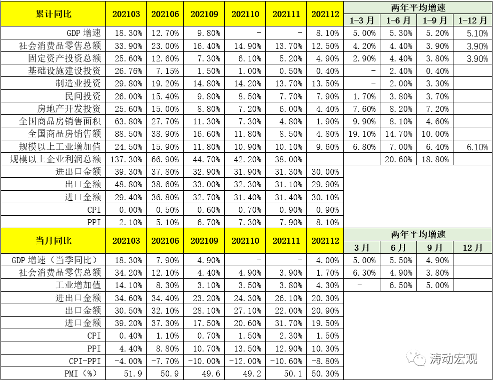 具體看,2021年全年經(jīng)濟(jì)增速達(dá)到8.10%(超過6%以上的經(jīng)濟(jì)增速目標(biāo)),全年兩年平均經(jīng)濟(jì)增速達(dá)到5.10%,但2021年一至四季度當(dāng)季經(jīng)濟(jì)增速分別為18.30%、7.90%、4.90%與4%,累計(jì)經(jīng)濟(jì)增速則分別為5%、5.30%、5.20%和5.10%,呈現(xiàn)出2021年下半年以來經(jīng)濟(jì)下行壓力逐漸增大的特征。