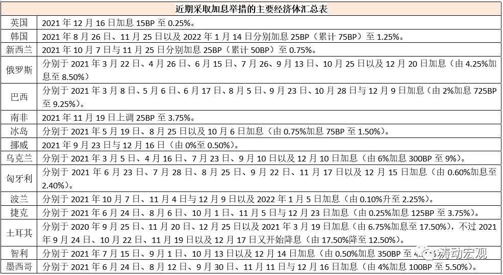 站在當(dāng)前來看,和上一輪美聯(lián)儲(chǔ)政策收緊過程相比,本輪最大的差異在于國內(nèi)貨幣政策的自主性以及監(jiān)管政策的高壓性更為突出,同時(shí)中國也在匯率方面也有更大的操作彈性和容忍度、通脹對(duì)貨幣政策的制約力度明顯下降等。這意味著,當(dāng)美聯(lián)儲(chǔ)Taper進(jìn)程加快、加息與縮表步伐提前時(shí),中國政策松一松的窗口期實(shí)際上是變得更短了,也更緊迫了。畢竟在美聯(lián)儲(chǔ)Taper加快的這段時(shí)期,中國經(jīng)濟(jì)又出現(xiàn)了新的下行壓力,穩(wěn)增長壓力正變得越來越突出,中國需要在美聯(lián)儲(chǔ)正式加息之前呵護(hù)好國內(nèi)經(jīng)濟(jì)基本面。特別是我們看到,2021年11月以來,已有英國、韓國、新西蘭、巴西、南非、烏克蘭、匈牙利、波蘭、捷克、智利和墨西哥等經(jīng)濟(jì)選擇加息,既包括發(fā)展中國家,也包括韓國和新西蘭等發(fā)達(dá)經(jīng)濟(jì)體。