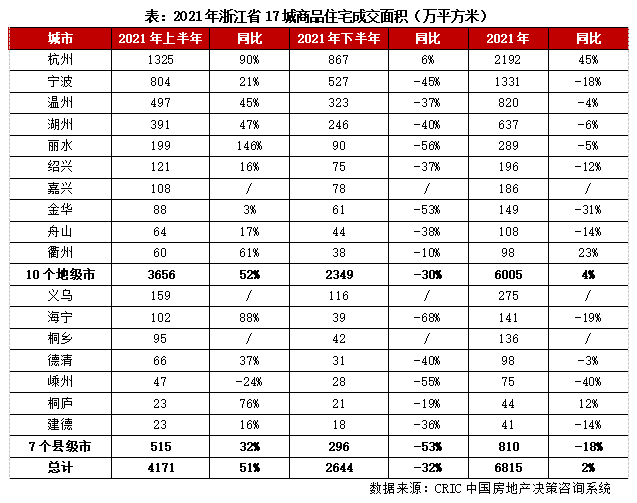 2021年上、下半年,浙江省房地產市場強、弱轉折,上半年市場異?;鸨?,下半年則持續轉冷。據CRIC監測數據顯示,上半年浙江省10個地級市商品住宅成交3656萬平方米,同比增長52%,7個縣級市成交515萬平方米,同比增長32%。其中,杭州、海寧等成交顯著放量,同比漲幅都在90%附近,麗水更是翻倍增長。下半年10個地級市成交跌至2349萬平方米,同比下降30%;7個縣級市成交降至296萬平方米,同比下降53%。其中,金華、海寧等市場持續低迷,成交同比腰斬。
