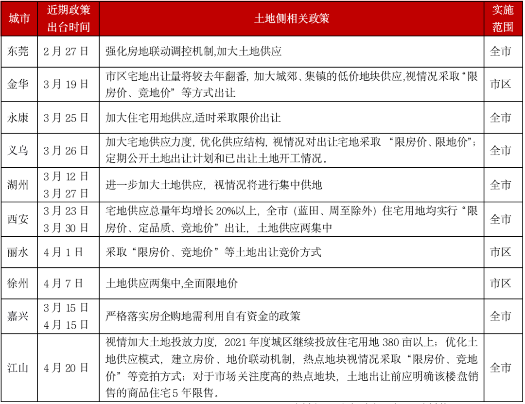 表:2021年以來非重點城市出臺政策涉及土地側調控內容一覽