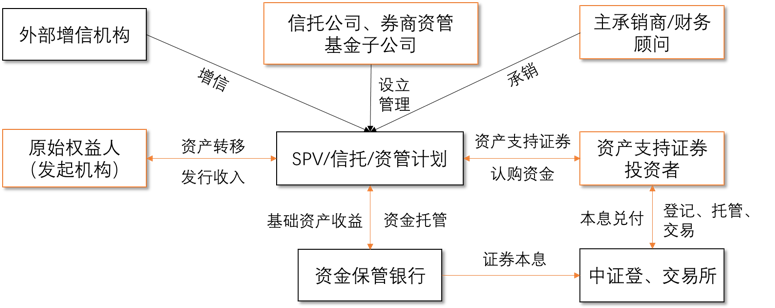 如上圖所示,這個資產包是一個特殊目的載體,需要一個管理人(或叫受托人),通常是信托公司或者其他履行相同職能的類似機構(本文討論服務信托,姑且以信托公司為例)。資產證券化與一般財產信托的差異就在于,前者在封包并創設了“信托受益權”(就是獲得信托財產和信托利益分配的權利)后,這個信托受益權被標準化、證券化,并公開出售給投資者。在資產證券化的交易場景中,我們一般將該“信托”稱之為“資產支持計劃”,對應出售給投資者的權益憑證稱之為“資產支持證券”。