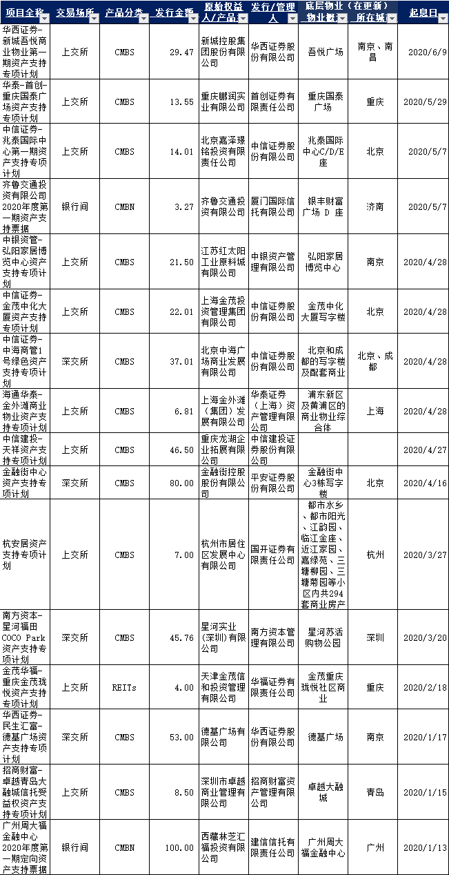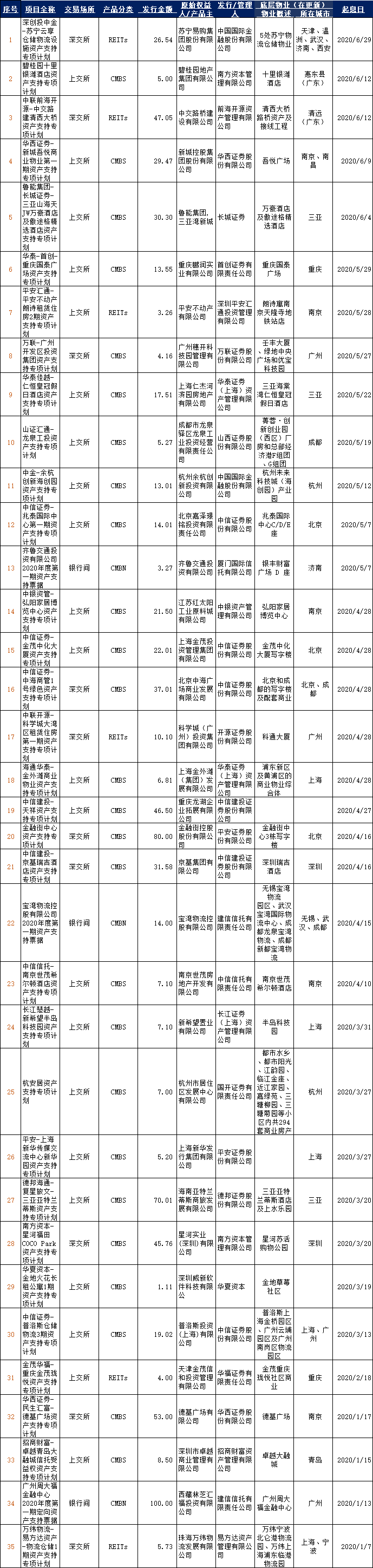 2020年1月1日至2020年6月30日,國內已發(fā)行CMBS(含CMBN、下同)/類REITs產品35單,總規(guī)模815.44億元(不含儲架規(guī)模),其中類REITs產品6只、CMBS產品29只(含CMBN3只)。其中以購物中心/商場為底層資產的CMBS/類REITs產品25只。標的物業(yè)分布以上海/北京居多及其他強二線城市為主。