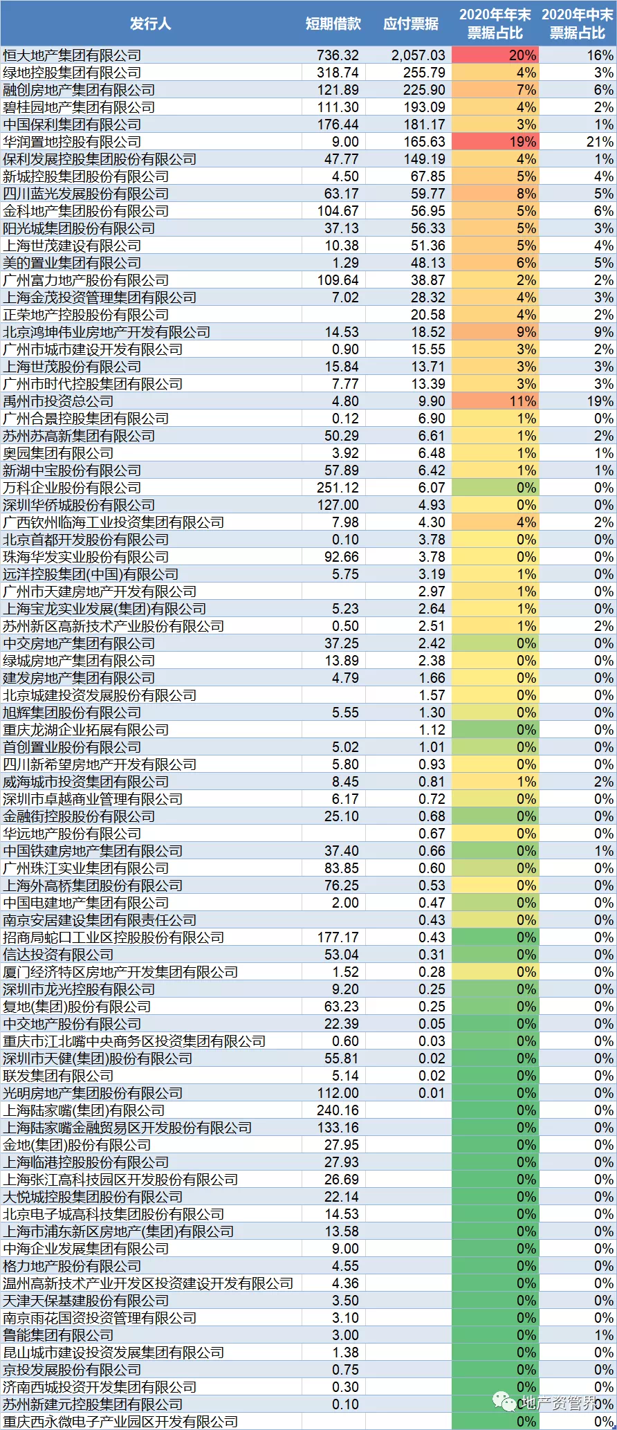一、如果房企商票頻頻違約, 那么商票后續的發行會面臨較大的沖擊和壓力,整個地產行業的信用乃至其他融資渠道也會受沖擊。二、目前,下游建材、輕工等行業供應商的交易訂單中, 房企等企業訂單占比較大。一旦出現商票違約,勢必會對下游行業造成嚴重的沖擊。而房企通過商票融資工具的對應成本也是存在非常大的差異。典型房企如中南建設、藍光發展和綠地控股 2020 年末應付票據占有息負債的規模為 13.48%、11.66%和 8.44%,應付票據占比處于前列。從房企商票年化利率數據來看,大多數重點房企的商票年化利率為 10%-20%。現金流較為緊張的房企如中國恒大、藍光發展其部分商票年化利率高達 36%,遠高于其融資成本。而杠桿率較低,債務風險較低的房企如華潤置地,其商票年化利率低至4%。2020年,房企商票承兌規模總體上呈井噴式增長。據統計,2020年頭部房企商票承兌余額達到3355.74億,較2019年增長了36.59%,占全國商票承兌總量的9.27%。這其中以恒大的商票發行規模最高,達到了2052億,而30億以上商票存續的房企達到17家。其中不乏融創、陽光城、富力等高杠桿企業,也包括建發、保利等國企。顯然,商票對于開發商而言不僅僅是一種融通工具,更是降杠桿的有效途徑。隨著市場周期下行,近些年來,頻繁出現開發商商票違約情形。需要明確的一點,商票本質上是依托于開發商的主體信用,而商票的違約也就意味著信用體系出現問題。網上已有多個持票人公開了拒付的票據證據。可以看到拒付情況或存在于恒大各地的子公司:恒大集團聲明中也沒有直接否認這一傳聞,表示“針對我司個別項目公司存在極少量商票未及時兌付的情況,集團高度重視并安排兌付”。恒大裸奔式發展導致大規模的商票違約,無疑是此次央行將商票納入重點監測范圍的導火索。更有甚者,據某平臺爆料,某閩系房企SM 子公司“淮南恒升天鵝灣置業有限公司”2021年6月1日到期的商業承兌匯票,尚未兌付。近期項目到期商票所涉及的開戶銀行賬戶資金,因一起建設工程施工合同糾紛訴訟處于司法凍結狀態,導致部分已到期商票銀行暫無法兌付。但該批商票,部分已經多次背書轉讓,最終持票人收款信息難以獲取。“大”如恒大,“強”如SM,不同程度的媒體報道或是捕風捉影,或是見微知著。以上僅是房地產公司與行業上下游之間商票違約的一個縮影而此次,商票納入強監管,會讓“三道紅線”的效果更加明顯。