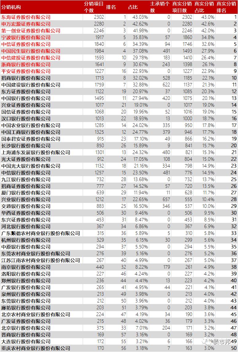 因為主承銷商天然就是承銷團員,而狹義上的分銷是承銷團員參與銷售非所在機構主承的債務融資工具的行為,為了更好地進行對比,將主承項目剔除后作為真實分銷項目進行排名出來的TOP50,結果如下所示。