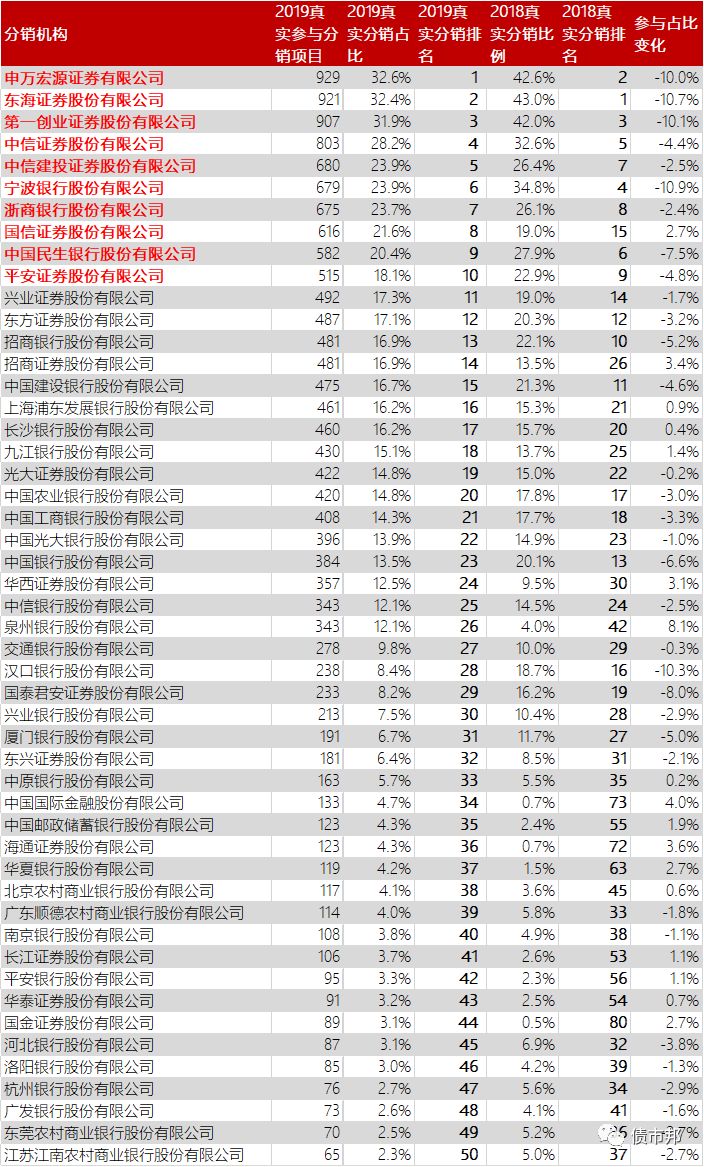 一是TOP3分銷機構依然是東海、申萬和一創的鐵三角,但是參與分銷項目占比較2018年下降了10個百分點左右。