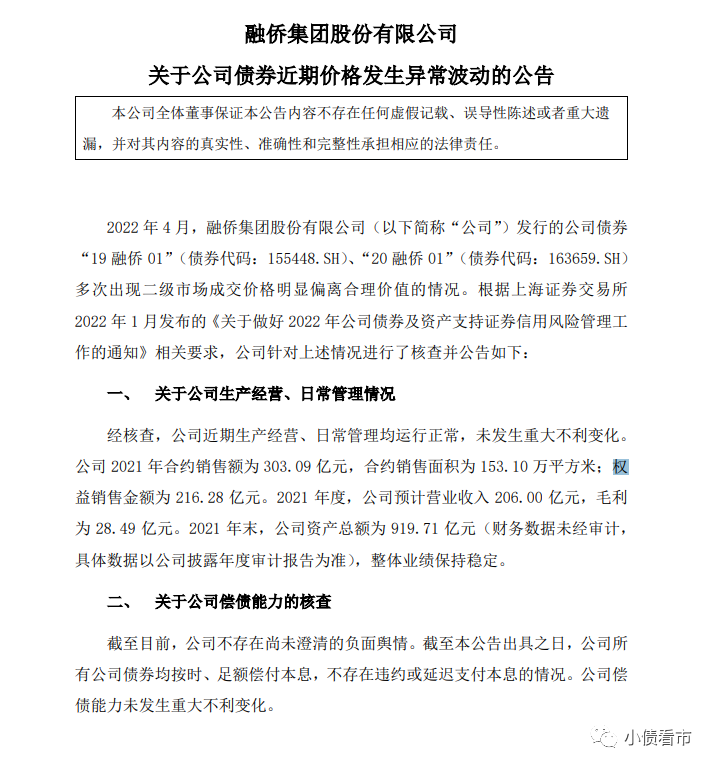 公告顯示,融僑集團不存在尚未澄清的負面輿情,截至2022年4月20日其所有公司債券均按時、足額償付本總,不存在違約或延遲支付本息的情況,公司償債能力未發生重大不利變化。