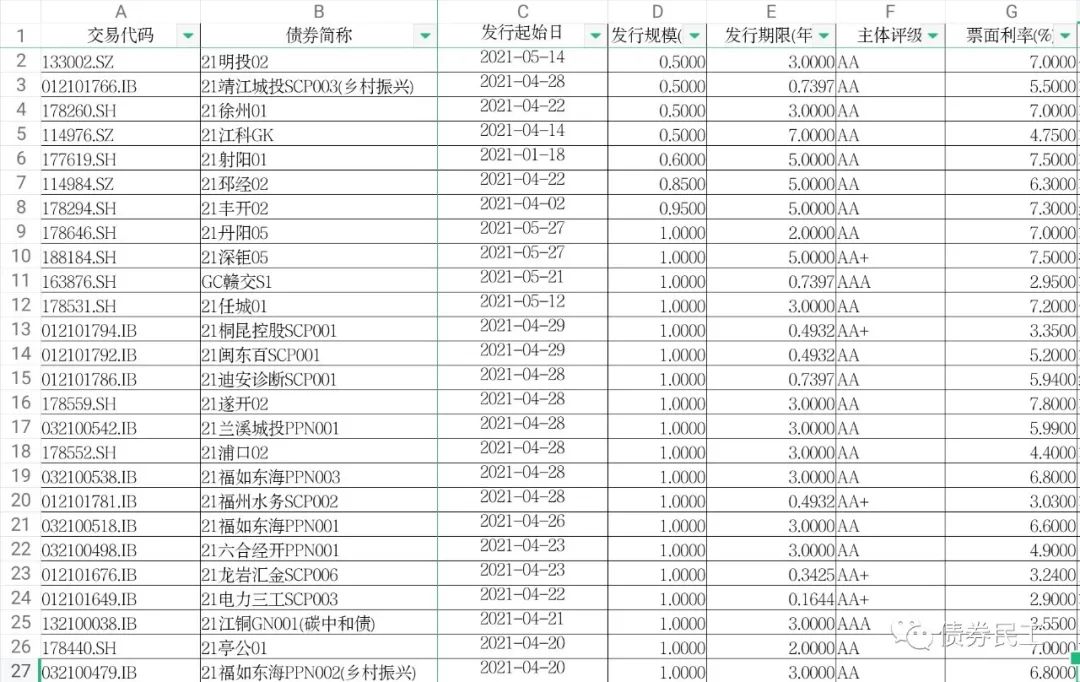 債券民工今天無意中發現,2021年以來,信用債券市場的最低發行金額還真的是超乎想象了。2021年1月1日至5月31日,發行金額為5000萬的就有4只債券,發行金額低于1億元的債券有7只!發行金額為1億元的債券共有46只!發行金額低于2億元的債券共有107只!