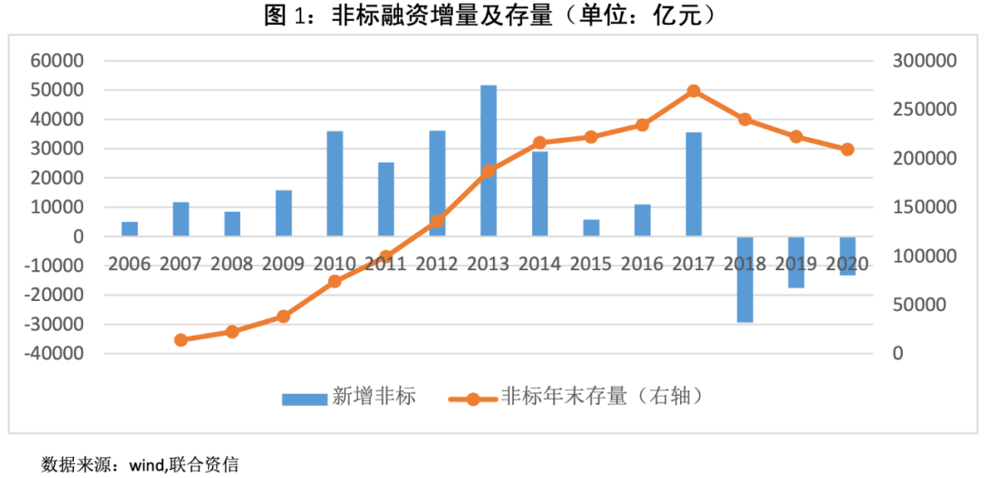 現有統計數據中,完整的非標融資新增量月度數據開始于2006年1月至今[4],存量數據從2015年3月末開始發布[5]。以此宏觀數據為基礎,我們可以觀察到:2006—2009年,是非標的初步發展時期,每年新增量在1萬億左右。2010—2014年為快速發展階段,每年新增量都在2萬億元以上,最高的2013年新增達5萬億元以上;2015—2017年進入緩慢增長期,新增量逐年增加,2017年達到本階段最高;2017年政策開始去杠桿,整頓影子銀行和理財,非標融資開始轉為收縮,2018年大幅收縮2.9萬億元,以后收縮幅度逐年收窄。存量上看,也是于2017年達到最高的26.9萬億元,隨后進入收縮趨勢,2020年非標融資存量為20.9萬億元,三年之間收縮了6萬億元。