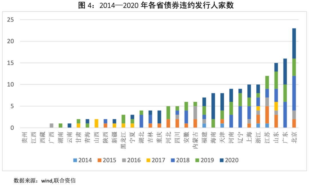 2014年以來各地區債券市場違約發行人數量的增加情況,與其非標融資收縮之間呈現出較為明顯的相關性。如北京市非標融資規模收縮最大,相應地債券違約數量最多,2014—2020年7年間北京共有24家發行人債券違約,非標融資大幅收縮的2018年和2020年,新增違約發人數明顯增多;廣東、山東等債券違約較多的地區,其非標融資規模也處于收縮之中,廣東債券發行人違約全部集中在2018—2020年非標融資大幅收縮時期;非標融資規模收縮幅度較大的遼寧、天津、湖北、上海等地區,債券發行人違約數量在近年來均增加較多。值得注意的是,江西、貴州、西藏三省至今沒有發生債券違約,除西藏自身特殊情況外,貴州的非標融資規模實際上是增加的,江西在2019年和2020年非標融資有所收縮,但2018—2020年三年總計收縮規模較小。以上情況說明,地區非標融資規模的收縮程度對其債券信用風險具有較為明顯的沖擊,隨著各地非標融資的進一步收縮,債券市場違約風險將承受較大壓力。信用風險影響方面,主要是對信托貸款、委托貸款依賴性強,缺少其他融資渠道的融資人,現金流趨于緊張,面臨較大信用風險,這樣的融資人主要集中在房地產開發企業及低資質地方國有企業(城投及產業企業)群體中。