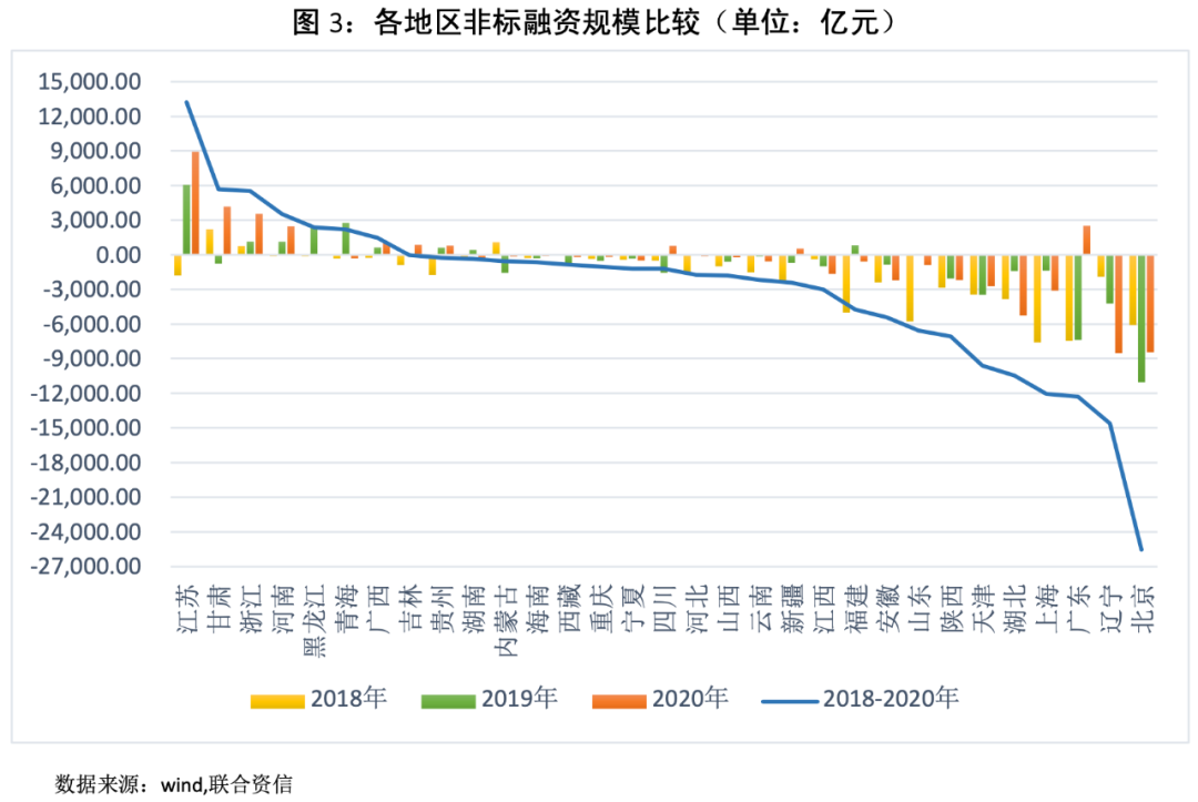 央行統計數據顯示,大多數省份2018年—2020年3年間非標融資凈增量為負值,或者說非標融資規模是在壓降政策作用下順勢收縮的,但有些地區仍在逆勢擴張。其中順勢收縮的地區有北京(-2.55萬億元)、天津(-0.96萬億元)、遼寧(-1.46萬億)、上海(-1.20萬億)、廣東(-1.23萬億)、湖北(-1.20)和山東(-0.67萬億)等22個省區,同時江蘇(+1.32萬億)、甘肅(+0.57萬億)、浙江(+0.55萬億)、河南(+0.35萬億)、黑龍江(+0.24萬億)和青海(+0.22萬億)7個省區非標融資規模繼續逆勢擴張。誠然順勢收縮的地區數量占大多數,但逆勢擴張地區的占比也不小,非標融資的地區分化特征比較明顯。