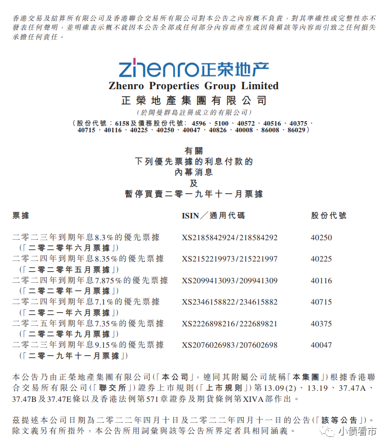 今年3月29日,正榮地產完成了由其擔保的4300萬美元ZhenAn票據、1.966億美元2022年4月票據、15.9億元人民幣2021年7月票據、2.7億美元2019年10月票據及2.19億美元2021年9月票據的交換。