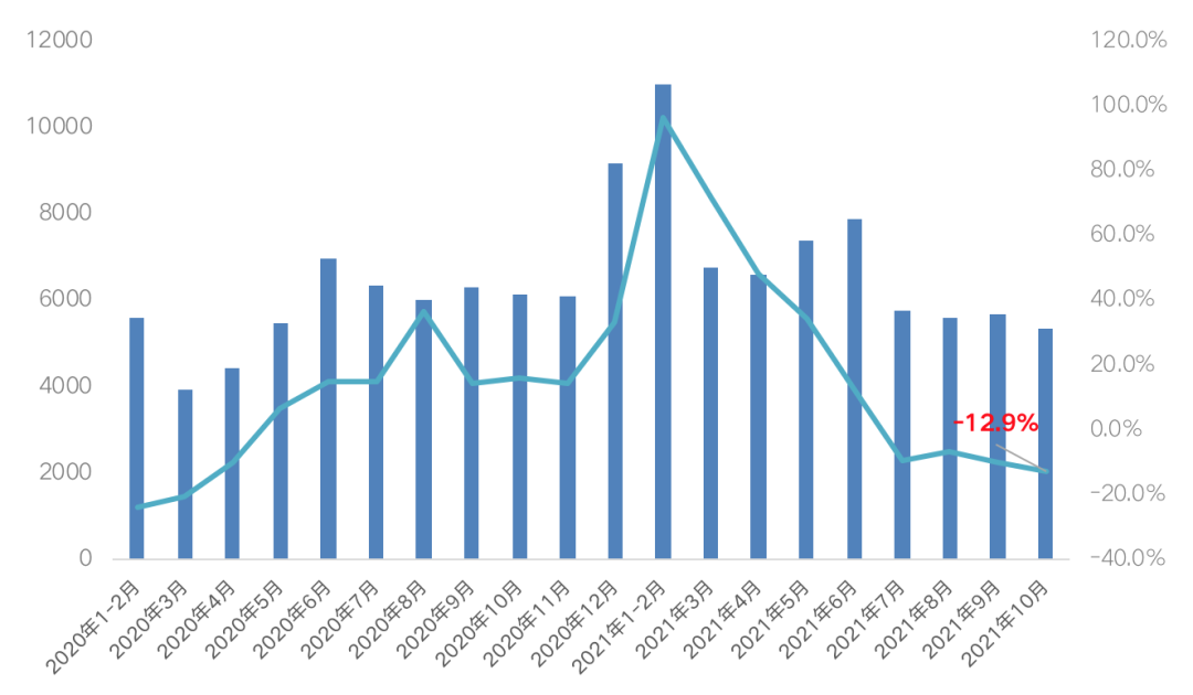 不過(guò)目前來(lái)看,定金與預(yù)收款月度同比增速正在持續(xù)走低,2021年10月,定金及預(yù)收款新增5351億元,同比下降12.9%,已降至年內(nèi)低位。