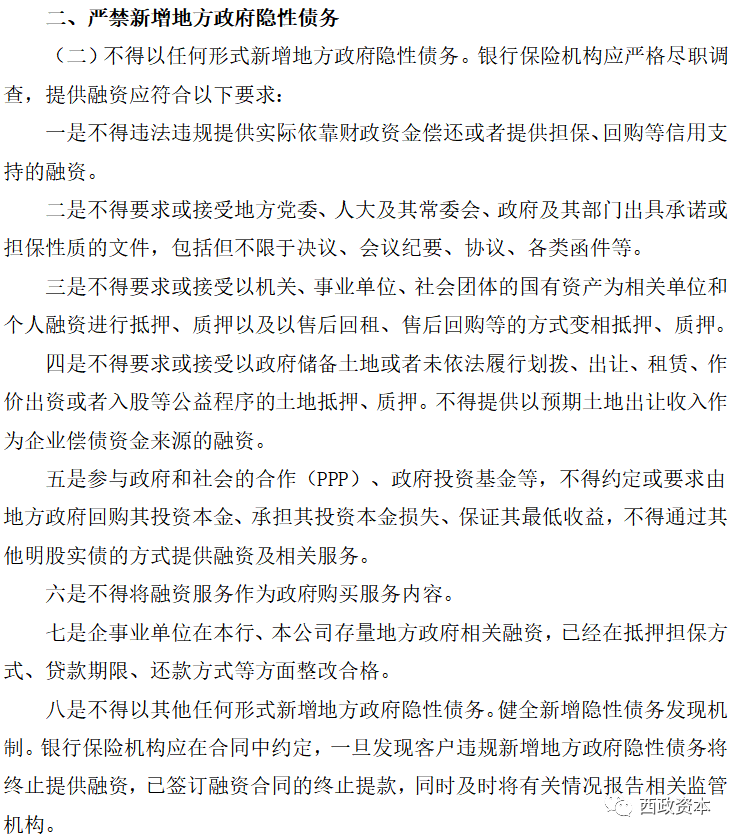 前文提到過(guò),在城投債與城投非標(biāo)都面臨壓縮的大背景下,城投債受到的影響更加明顯(弱資質(zhì)城投發(fā)債已難以為繼),因此大部分城投平臺(tái)被壓縮的債券融資將更加依賴非標(biāo)融資的補(bǔ)充。需注意的是,在城投平臺(tái)的非標(biāo)融資業(yè)務(wù)中,目前比較難處理的是融資主體和融資產(chǎn)品架構(gòu)的問題,其中因城投平臺(tái)本身與地方政府有無(wú)法割裂的聯(lián)系,因此在融資層面如何確保城投平臺(tái)的融資不違反15號(hào)文是首先要解決的問題,以下再看看15號(hào)文中關(guān)于新增政府隱性債務(wù)的限制性規(guī)定: