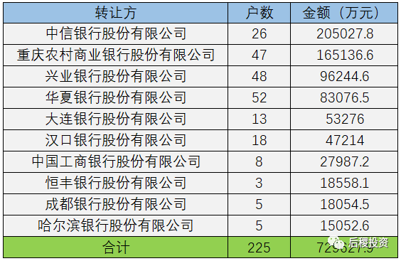 中信銀行出讓金額連續(xù)兩年保持第一,建設(shè)銀行、浦發(fā)銀行、中國(guó)進(jìn)出口銀行、光大銀行、中國(guó)銀行、廈門銀行跌出前十,華夏銀行、大連銀行、漢口銀行、恒豐銀行、成都銀行、哈爾濱銀行則進(jìn)入前十榜單。