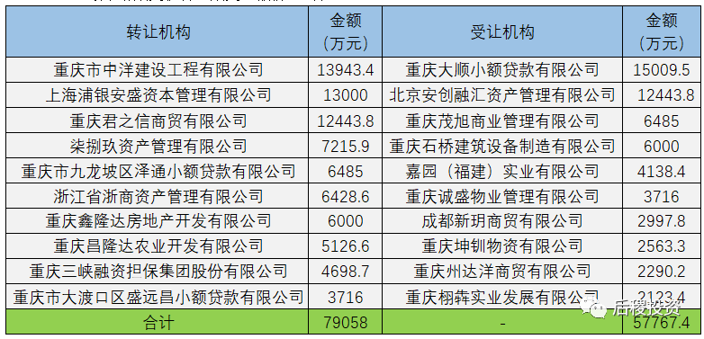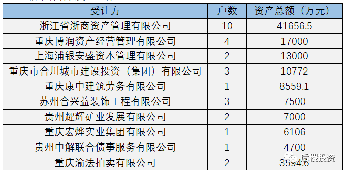 轉(zhuǎn)讓機(jī)構(gòu)中,上述10家轉(zhuǎn)讓機(jī)構(gòu)出讓總金額近8億元,在三級(jí)出讓市場(chǎng)中占38%;受讓機(jī)構(gòu)中,上述10家受讓機(jī)構(gòu)受讓總金額近6億元,在三級(jí)受讓市場(chǎng)中占18.3%。相對(duì)其他省份而言,在重慶不良資產(chǎn)三級(jí)市場(chǎng)上,多次見到小額貸款公司的身影,該特征與重慶當(dāng)?shù)卣呦⑾⑾嚓P(guān)。