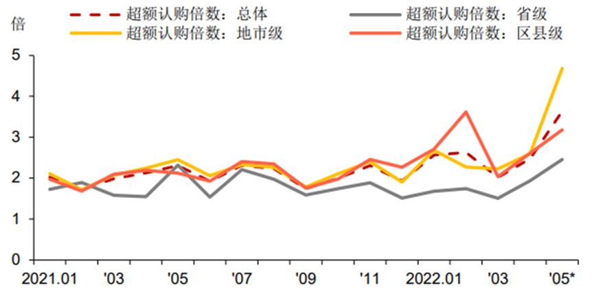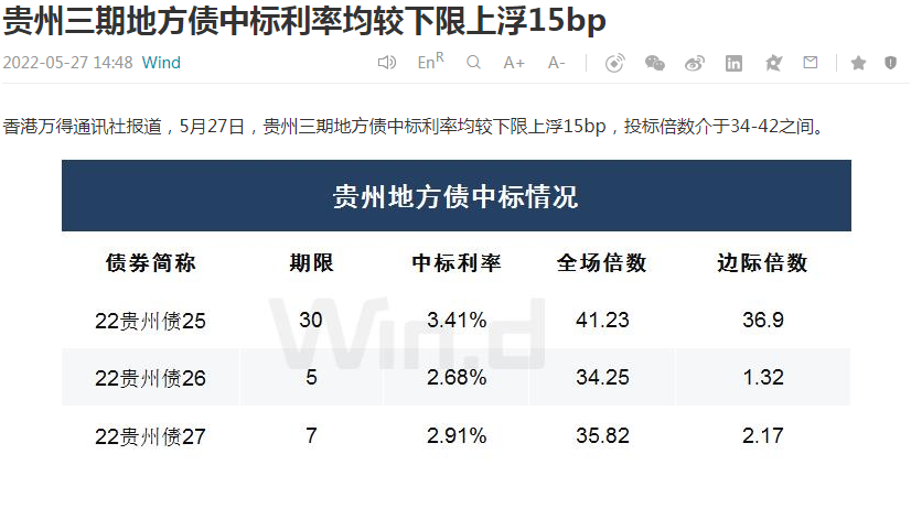 無獨(dú)有偶,5月27日,貴州三期地方債中標(biāo)利率均較下限上浮15bp,投標(biāo)倍數(shù)介于34-42之間。數(shù)據(jù)顯示,22貴州債25/26/27(對(duì)應(yīng)期限30/5/7)的全場認(rèn)購倍數(shù)為41.23/34.25/35.82。