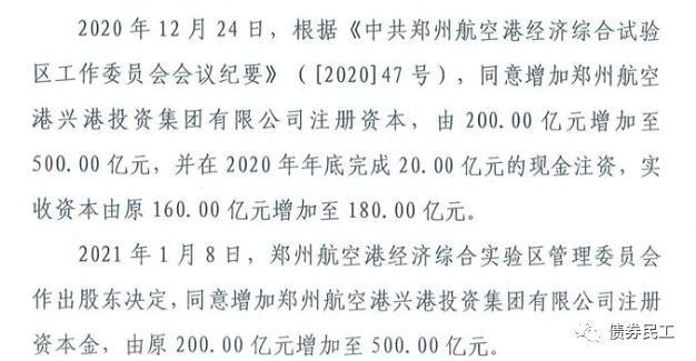 在此之前的2021年2月9日,興港投資公告,根據鄭州航空港綜合實驗區工作委員會的相關文件,公司注冊資本由200億元增資至500億元,并在2020年底完成20億元的現金注資。雖然注資金額和注資時間和文件要求有所差異,但是畢竟邁出了增資至500億元的第一步。