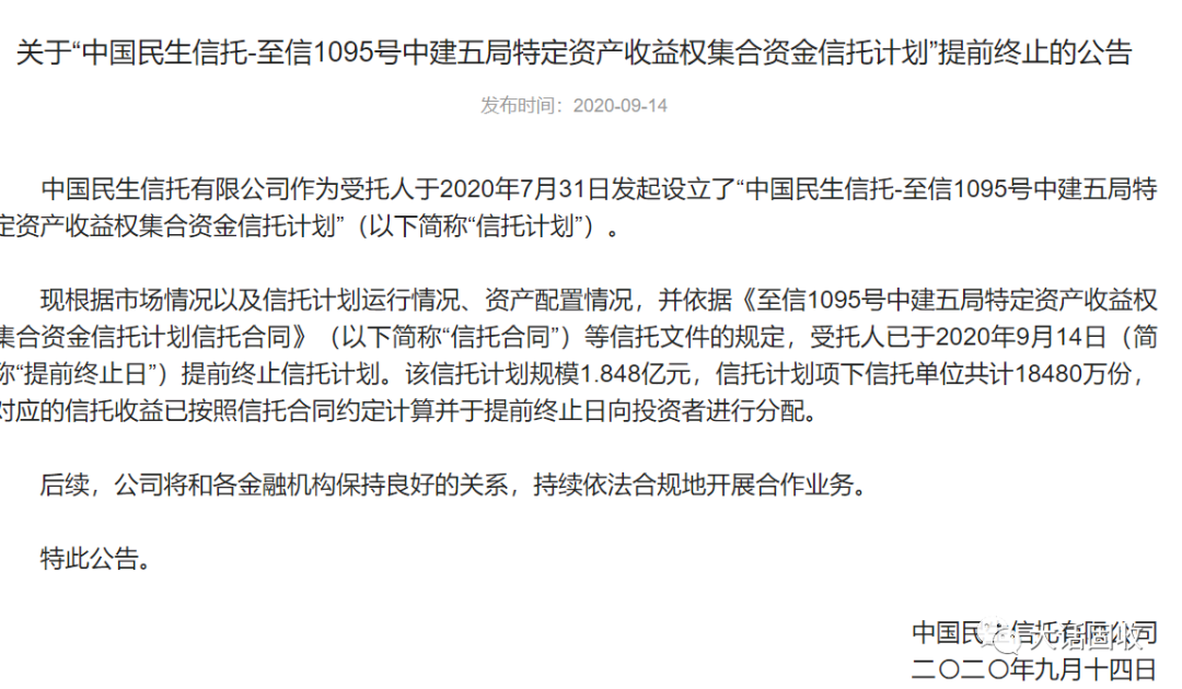 突然被CUE,民生信托也沒有慌,上周五鎮定公告項目提前結束,本周一就給了收益分配通知: